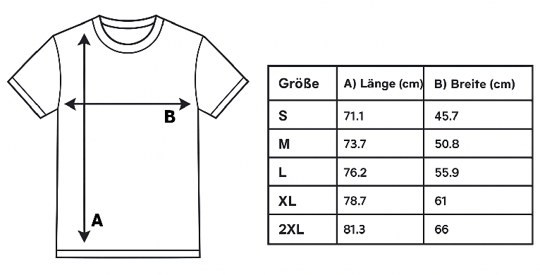 Shirts können einen Tick größer ausfallen, daher bitte vor der Bestellung mit den angegebenen Maßen vergleichen.